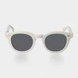 Donegal White con lenti grigie celebra il potere del minimalismo attraverso una montatura audace e luminosa.