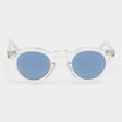 L'iconica montatura rotonda con ponte a chiave è rivisitata con una combinazione di colori moderni. Montatura trasparente in bio-acetato e lenti blu bio-based, perfetti sia per lui che per lei. Fatti a mano in Italia.