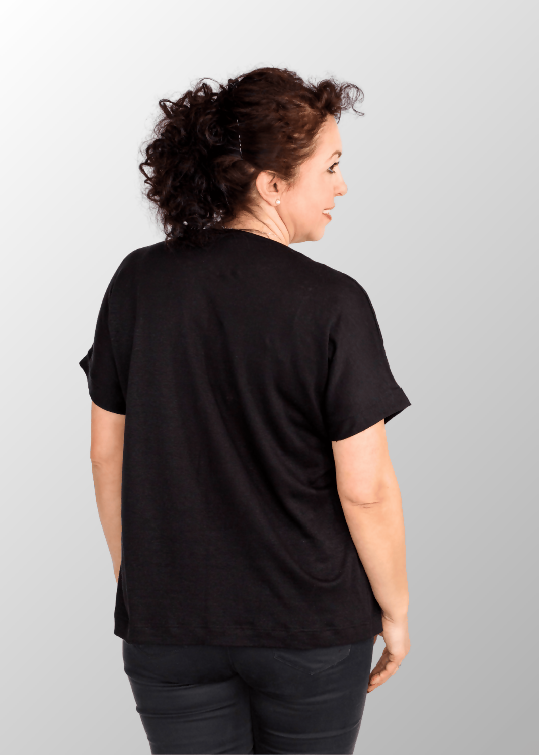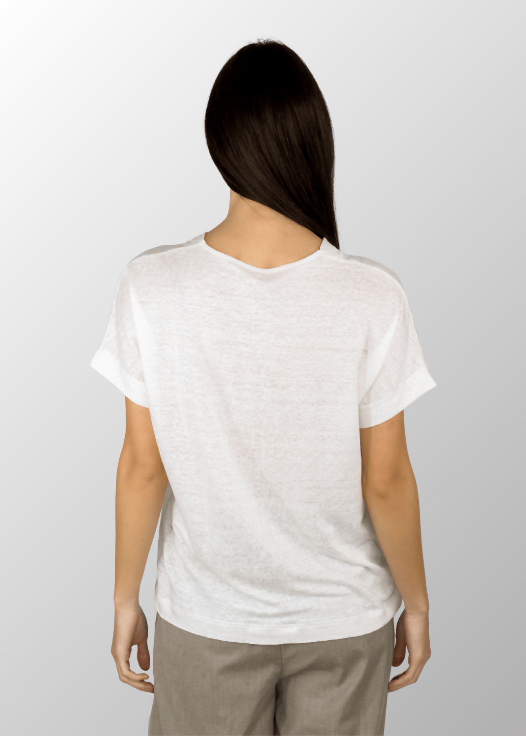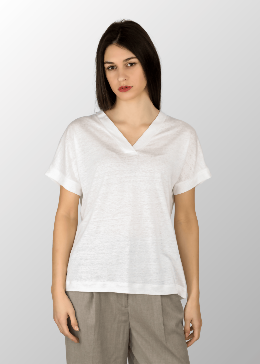 T-shirt da donnaย con scollo a V in Puro Lino, la scelta ideale per lโestate. La sua leggerezza e traspirabilitร ti garantiscono freschezza e comfort in ogni occasione. Il design minimalista la rende facilmente abbinabile a qualsiasi outfit, mentre lo scollo a V aggiunge un tocco di femminilitร ed eleganza. Perfetta con pantaloni a sigaretta e sandali, per un look casual ma raffinato.