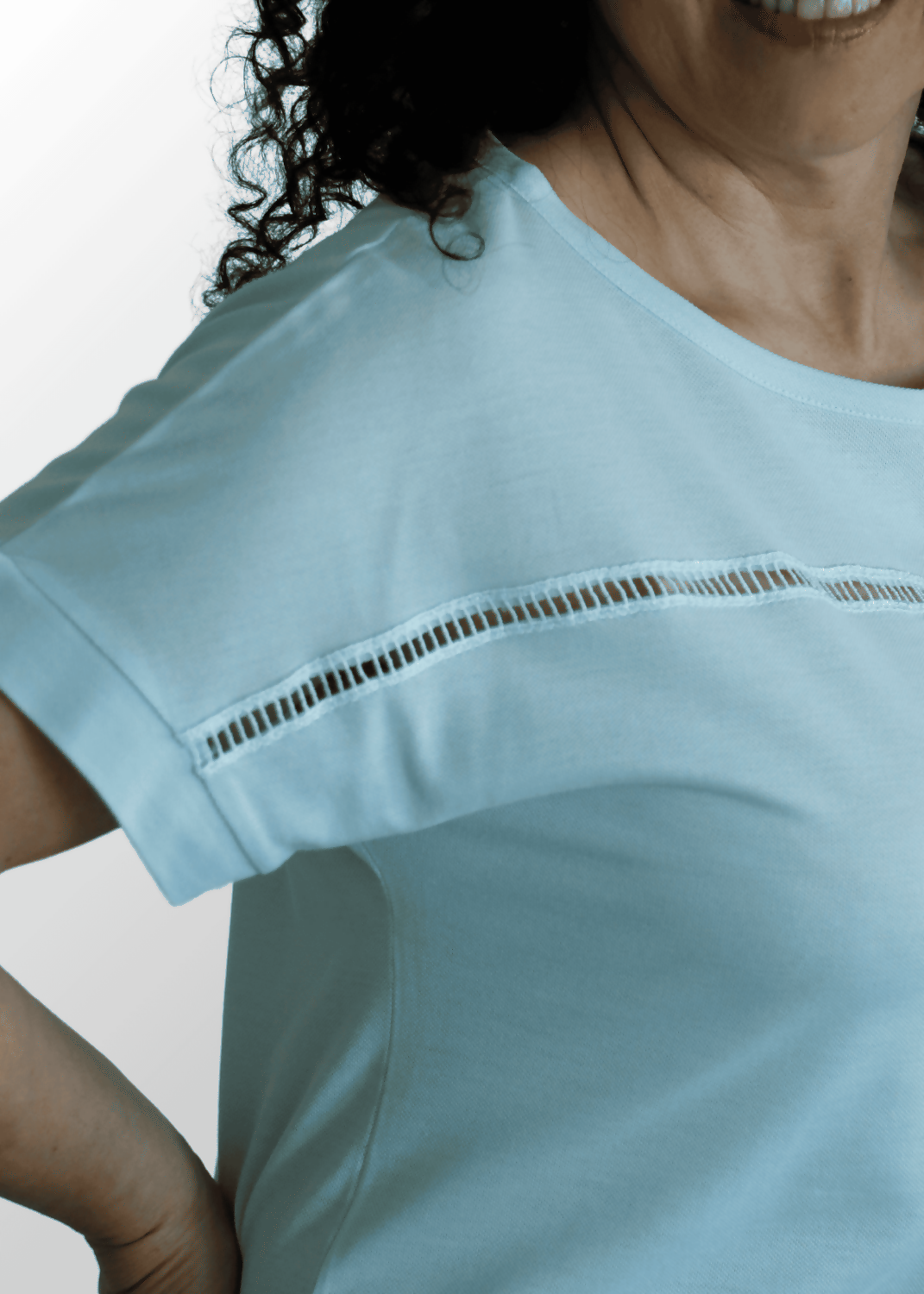 T-shirt da donna in Cotone Seta. Sul busto presenta un ricamo geometrico traforato in "à jour". Il tessuto è realizzato in piquet, una particolare trama a "nido d'ape" nota per la sua resistenza e traspirabilità. Si tratta di un capo molto indicato per la stagione estiva che mantiene inalterate forma e lucentezza anche dopo numerosi lavaggi. Stile casual per ogni occasione.