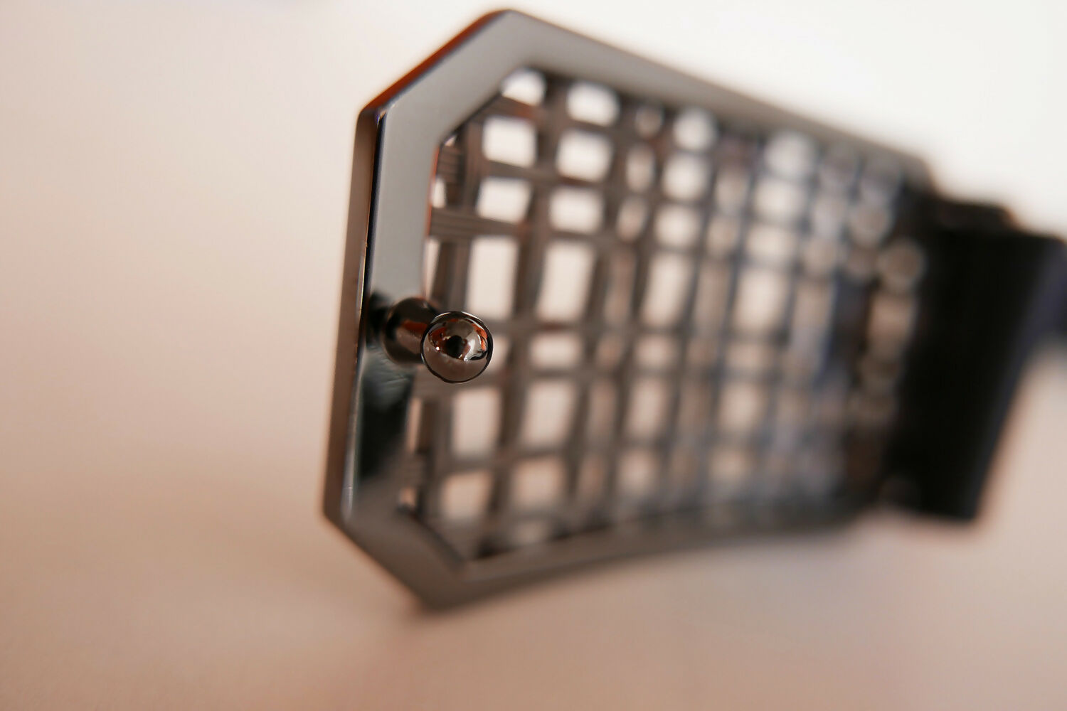La nostra deposizione galvanica elettrochimica riveste la fibbia con uno strato di palladio per migliorarne le proprietà, come resistenza alla corrosione, durezza e aspetto estetico, ulteriormente impreziosito da una sfumatura ottenuta mediante asportazione artigianale di un sottile strato di oro nero.