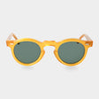 Best-seller per eccellenza. Questi occhiali da sole rotondi color miele in bioacetato, abbinati a lenti verde bottiglia, creano un accessorio dal design intramontabile. 100% Made in Italy.