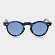 Questi occhiali da sole rotondi dagli eleganti toni blu oceano, sono completati da lenti blu che conferiscono modernità ad un modello iconico. Realizzati in bioacetato e lenti bio-based, sono totalmente sostenibili.