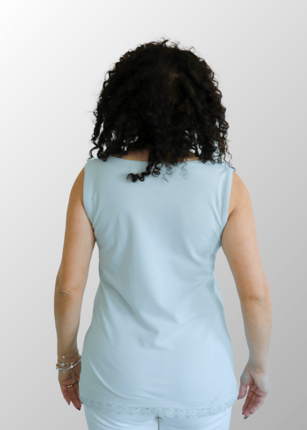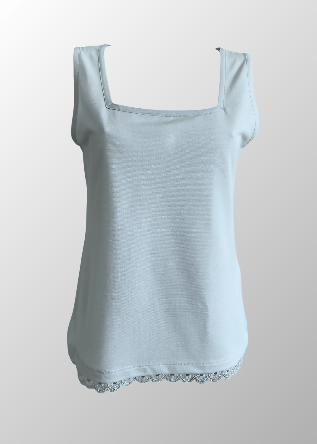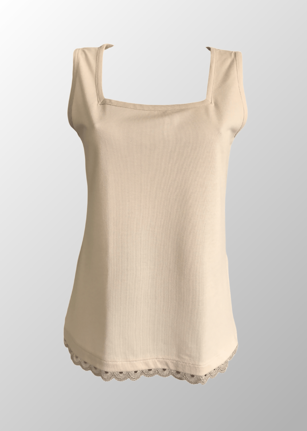 Canotta a spalla larga da donna in Cotone Seta. Presenta uno scollo quadrato e, sul bordo inferiore del busto, un pizzo macramé a ondine. Il tessuto è realizzato in piquet, una particolare trama a "nido d'ape" nota per la sua resistenza e traspirabilità. Si tratta di un capo molto indicato per la stagione estiva che mantiene inalterate forma e lucentezza anche dopo numerosi lavaggi. Questo capo è pensato per essere indossato in tutte le occasioni.