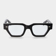 Unisex and contemporary, the black Raso eyeglasses are distinguished by their rectangular front and wide temples. Handcrafted in Italy from bioacetate and biodegradable trial lenses, they are 100% sustainable.