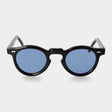 The iconic Welt collection features a classic black frame paired with blue lenses. The round silhouette in sustainable bioacetate and bio-based lenses make it a contemporary and eco-friendly accessory.