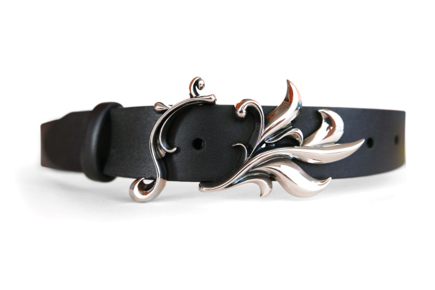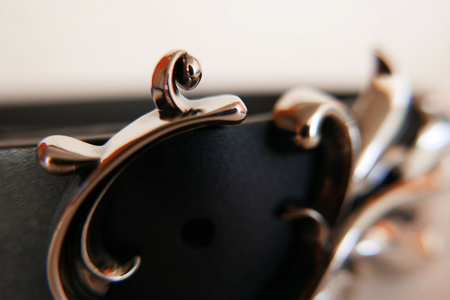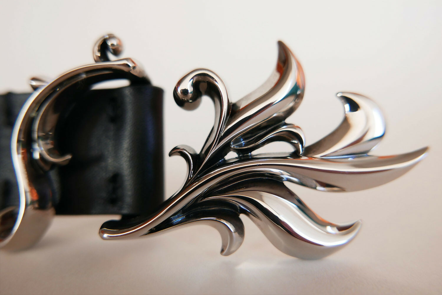Our electrochemical galvanic deposition coats the buckle with a layer of palladium to improve its properties, such as corrosion resistance, hardness and aesthetic appearance, further enhanced by a nuance obtained by hand-removing a thin layer of black gold.