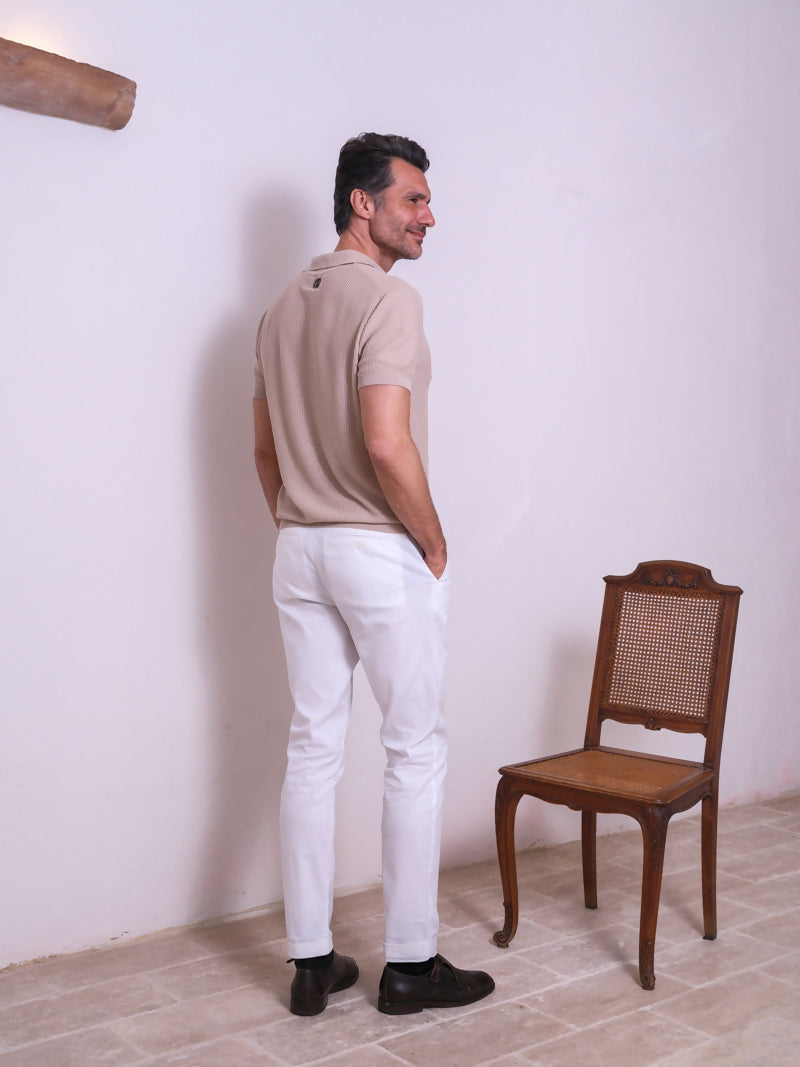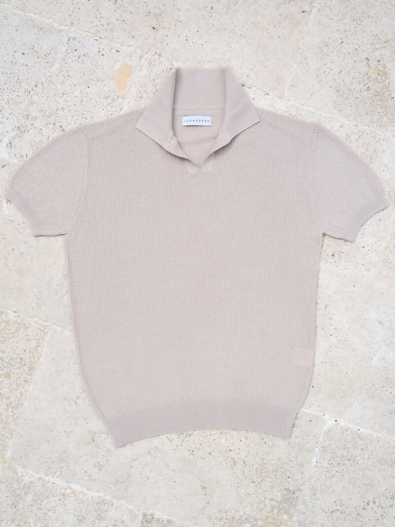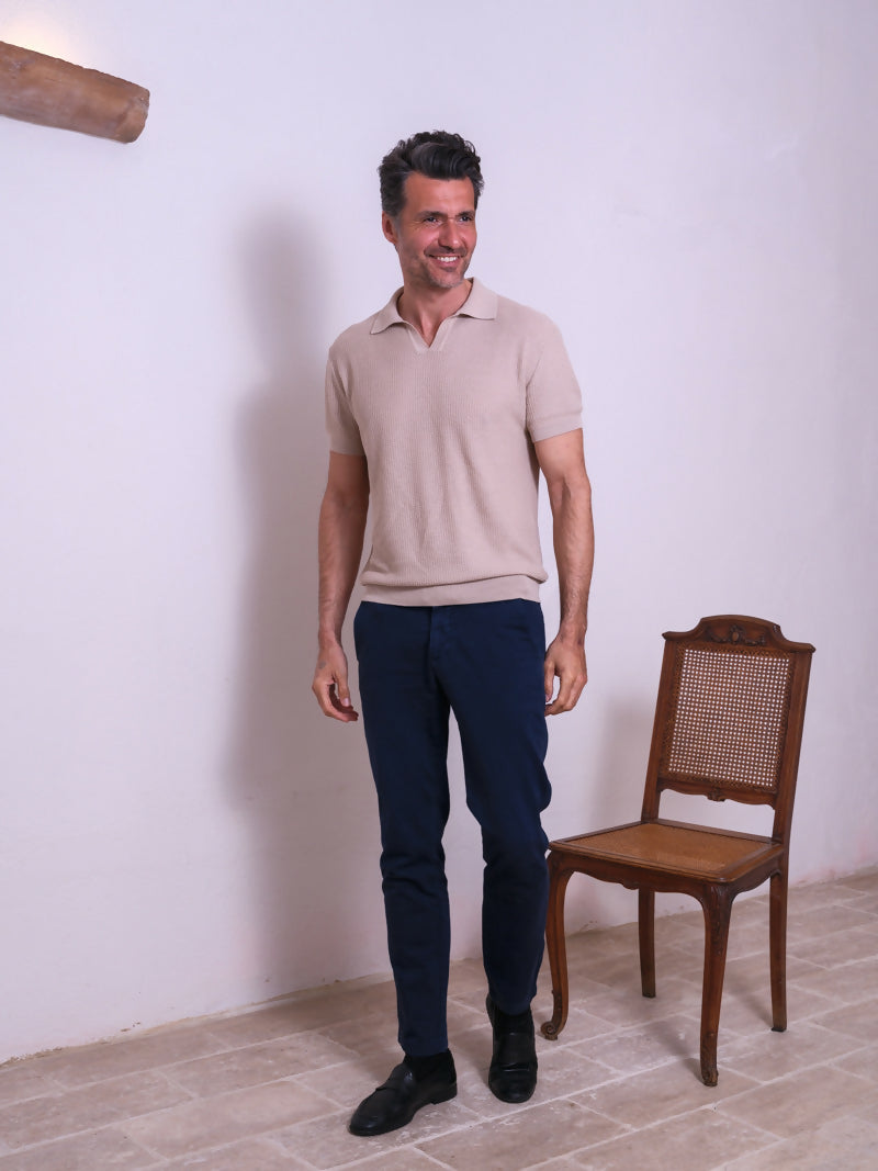 In polo, the offside forehand shot is a straight, offside shot, a deep, essential strike. Hence the idea of reinterpreting the classic polo shirt in a lighter, more versatile version. The texture lends it a refined touch, while the silk makes it unique, unconventional, and unconventional.